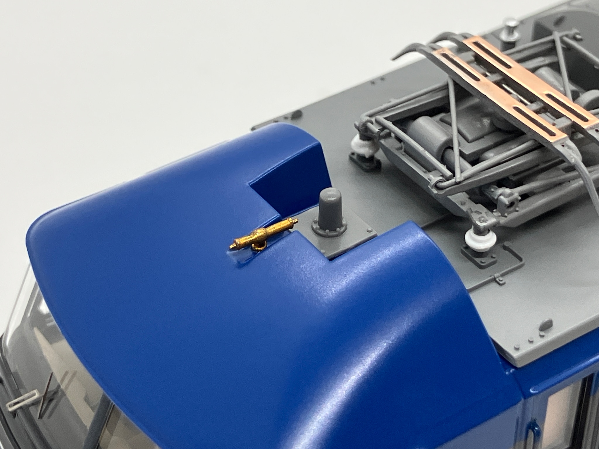 通常品だとパンタグラフの上半分は金属のむき出しとなっており,いかにも「プラ製」の雰囲気を醸し出します。しかし塗装をするだけでも上図のような仕上がりに。