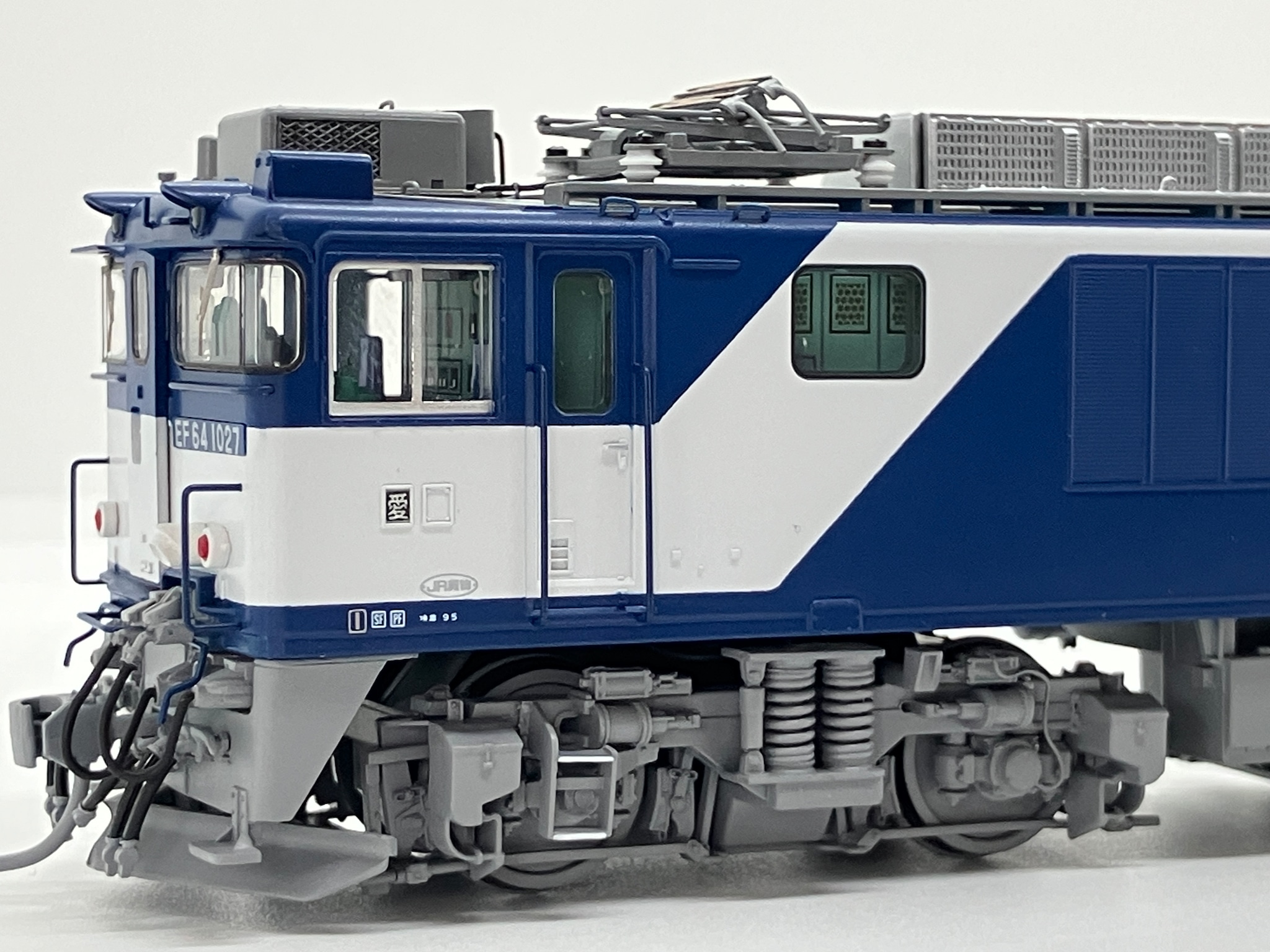 このEF64-1000で一番の注目ポイントになります。PT(パンタグラフ)から避雷器へ向かう配管ですが,ステーを介して一段上がっているのが特徴的です。