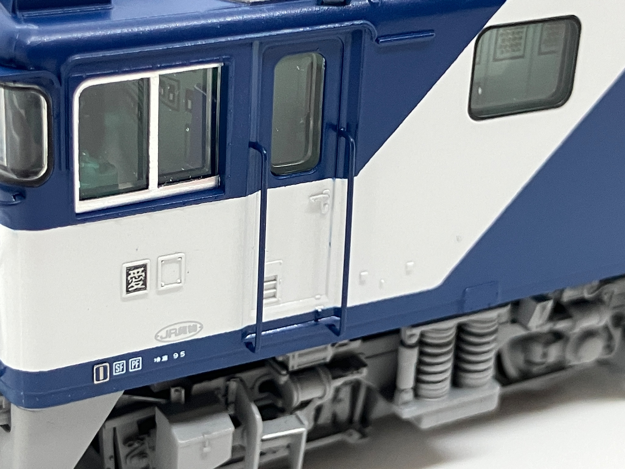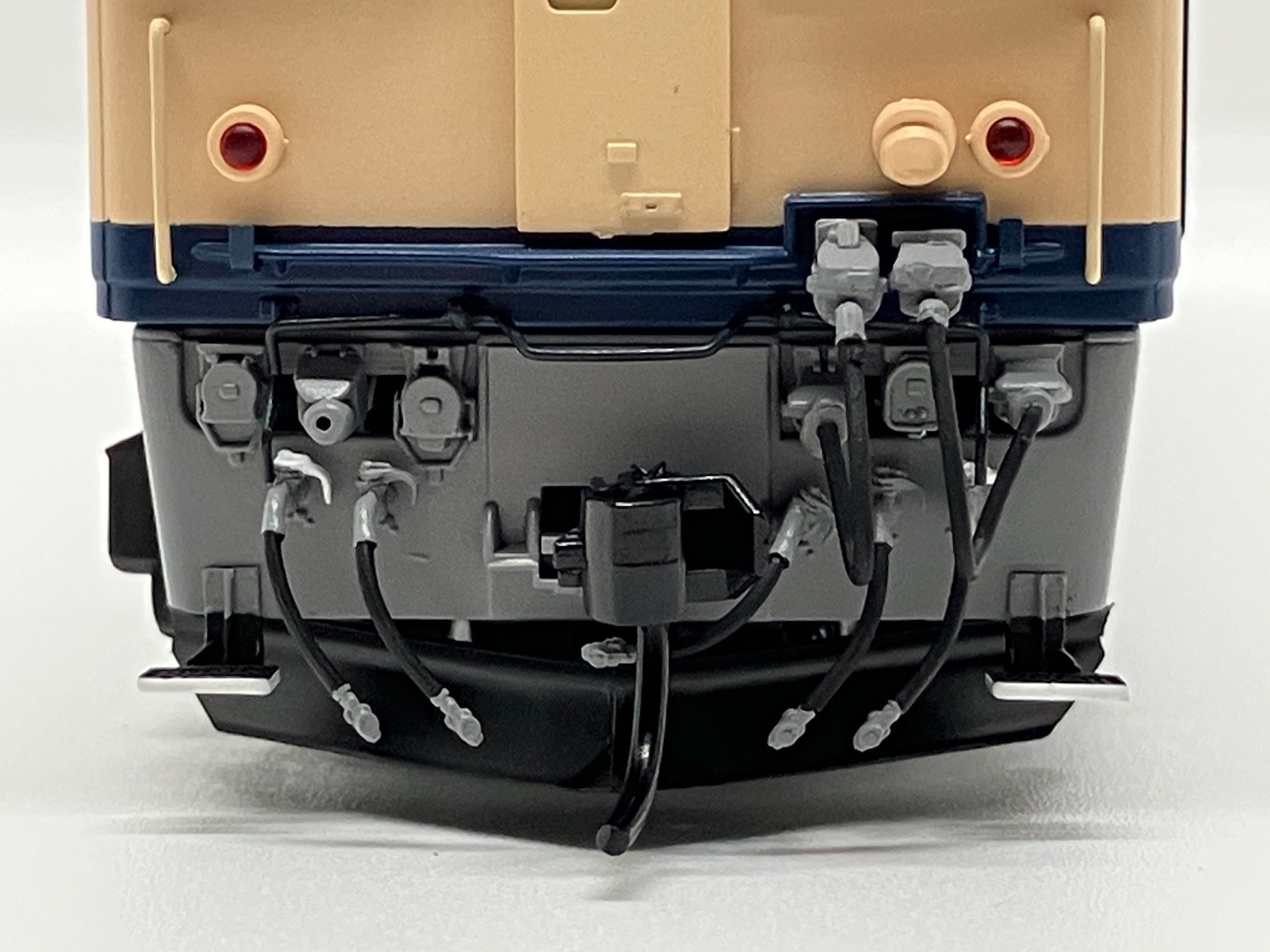 特徴的な軸箱から伸びる配線や床下機器表面の手すり部分を金属化します。
